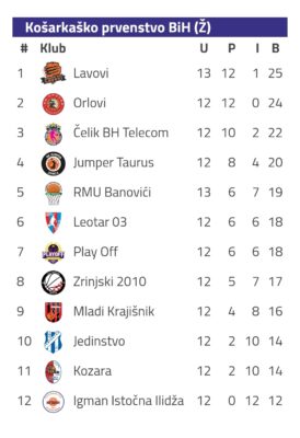 Pobjeda protiv Banovića prije dva dana u Brčkom u utakmici 14. kola, omogućila je Lavicama da sa utakmicom više izbiju na vodeću poziciju na tabeli šampionata Bosne i Hercegovine sa skorom 12-1 i ukupno 25 osvojenih bodova. Već sutra (subota 27.01.2024) naše košarkašice očekuje nova utakmica, odnosno derbi kola u kojoj će snage odmjeriti sa trenutno trećeplasiranim sastavom domaćeg šampionata, ekipom KŽK Čelik na gostujućem terenu u Zenici.