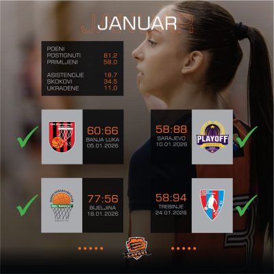 Januar mjesec tekuće godine donio je našim košarkašicama ukupno četiri utakmice u Prvenstvu Bosne i Hercegovine u kojima su ostvarile isto toliko pobjeda i zadržale lidersku poziciju na prvenstvenoj tabeli.